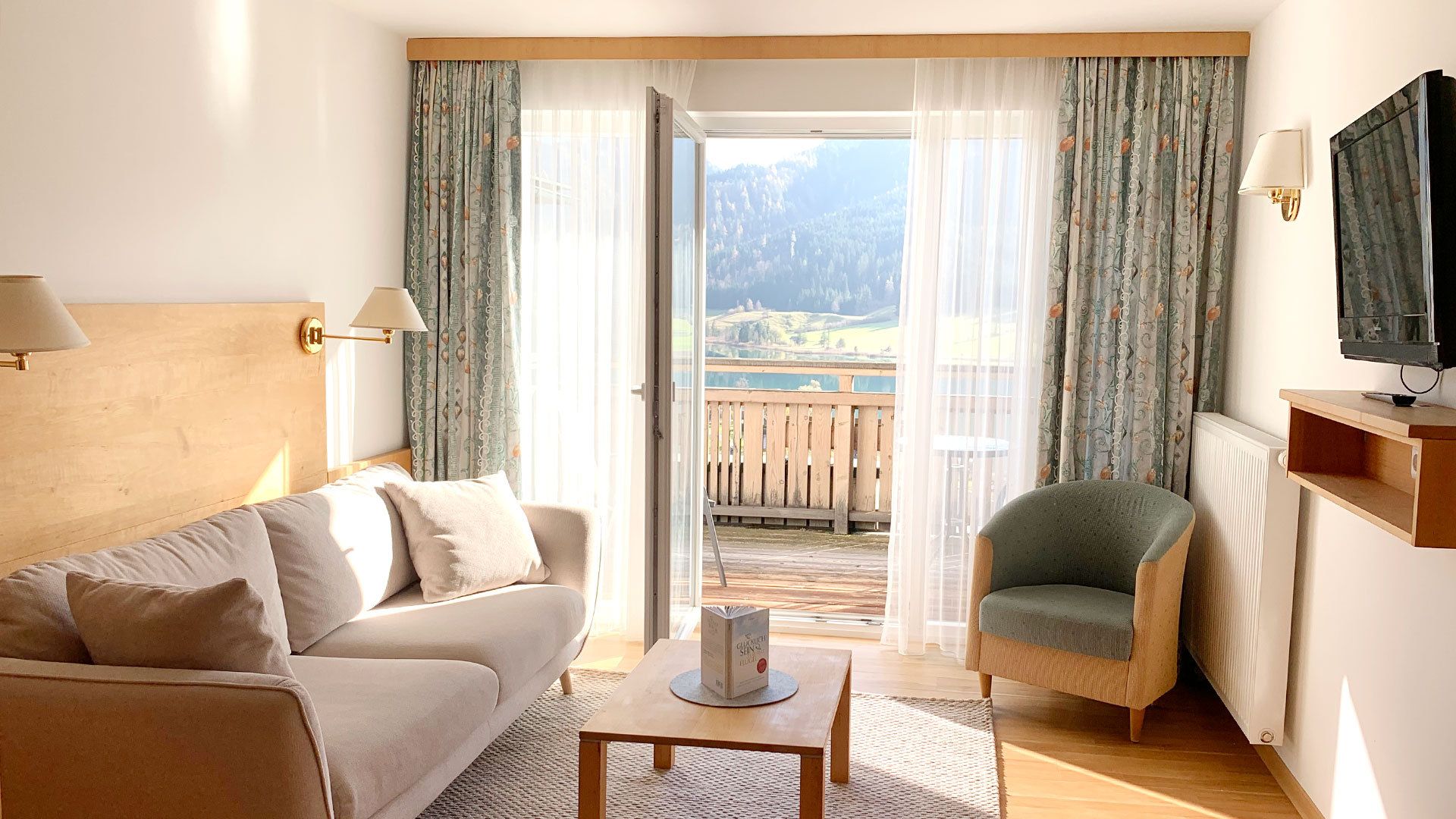 Genießen Sie die wohltuenden Facetten im Vitalbereich mit finnischer Sauna, Bergkräutersauna, Tepidarium im Winter und Außen Zuber mit Quellwasser. Der Panoramaruheraum gibt den Blick auf den Weissensee frei.